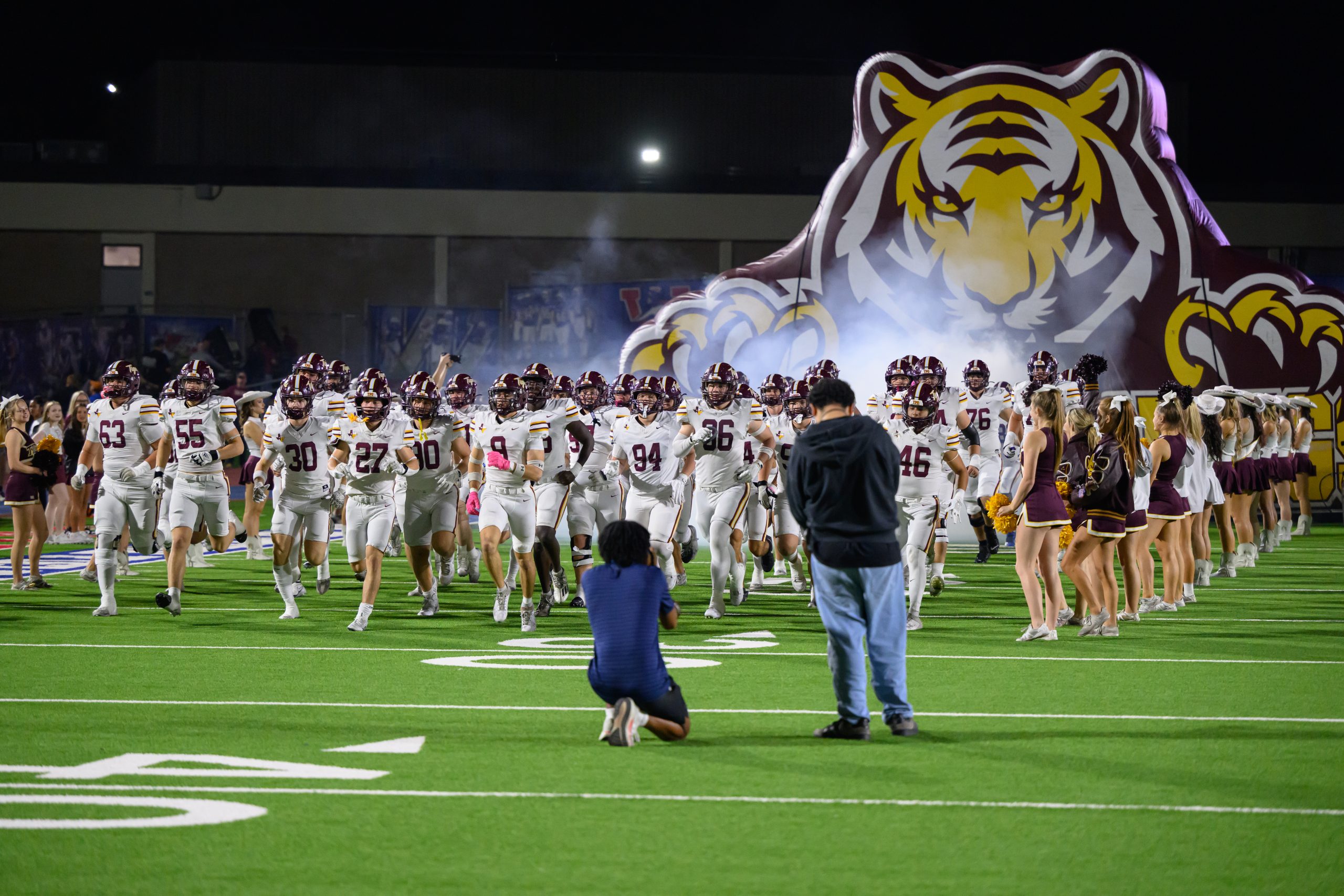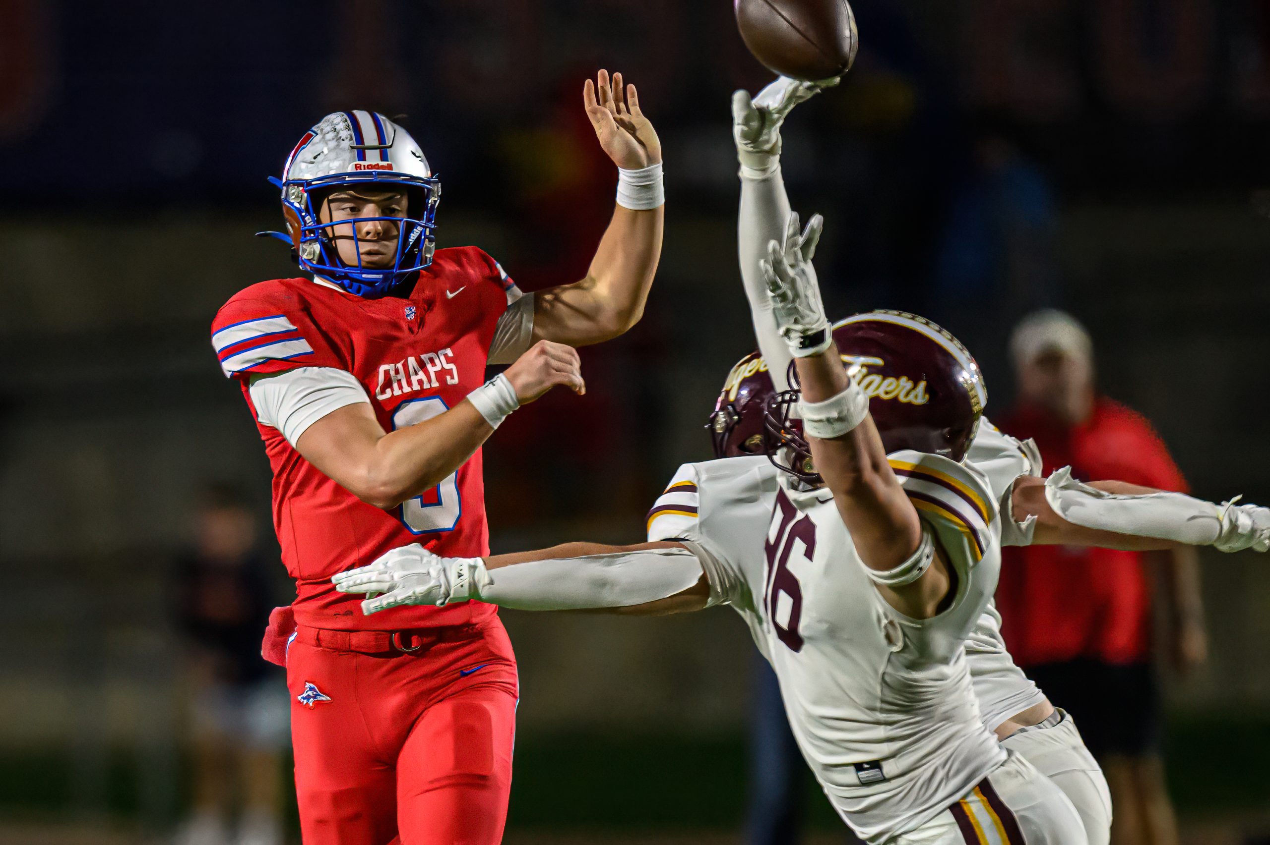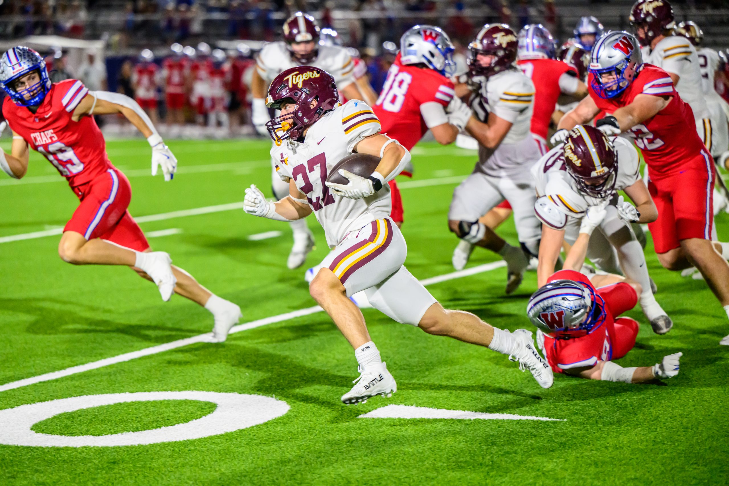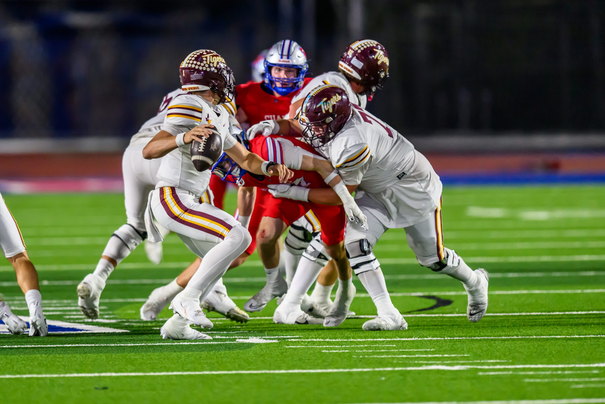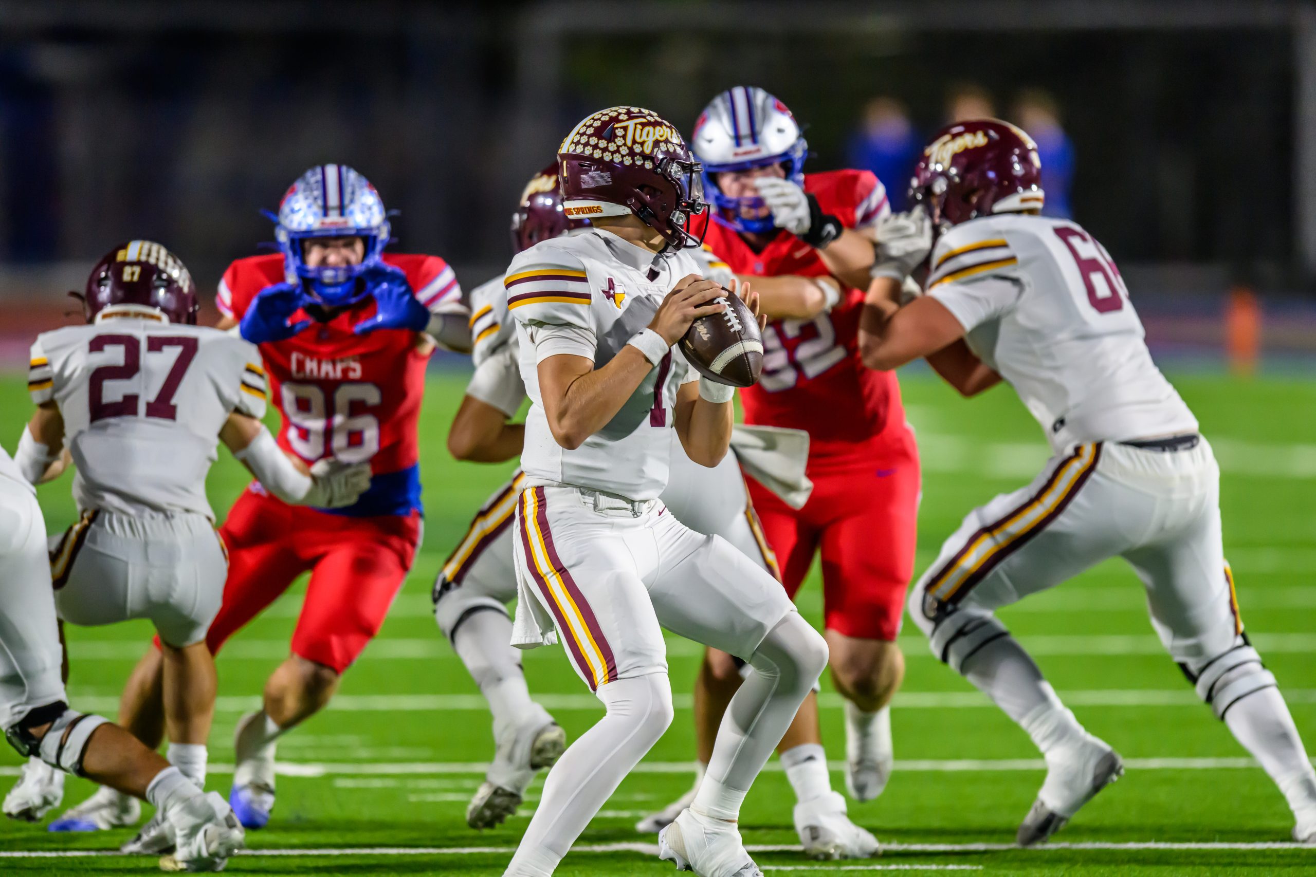 Dripping Springs earned its first-ever win over Westlake on Friday at Chaparral Stadium, rallying for a 45 to 35 victory. The Tigers trailed 35 to 28 with 10 minutes left, then closed with 17 straight points to secure the district’s top Division II playoff seed and a home game next week. The result placed Dripping Springs second overall in District 26 6A at 5 and 1, while Westlake finished third at 4 and 2.